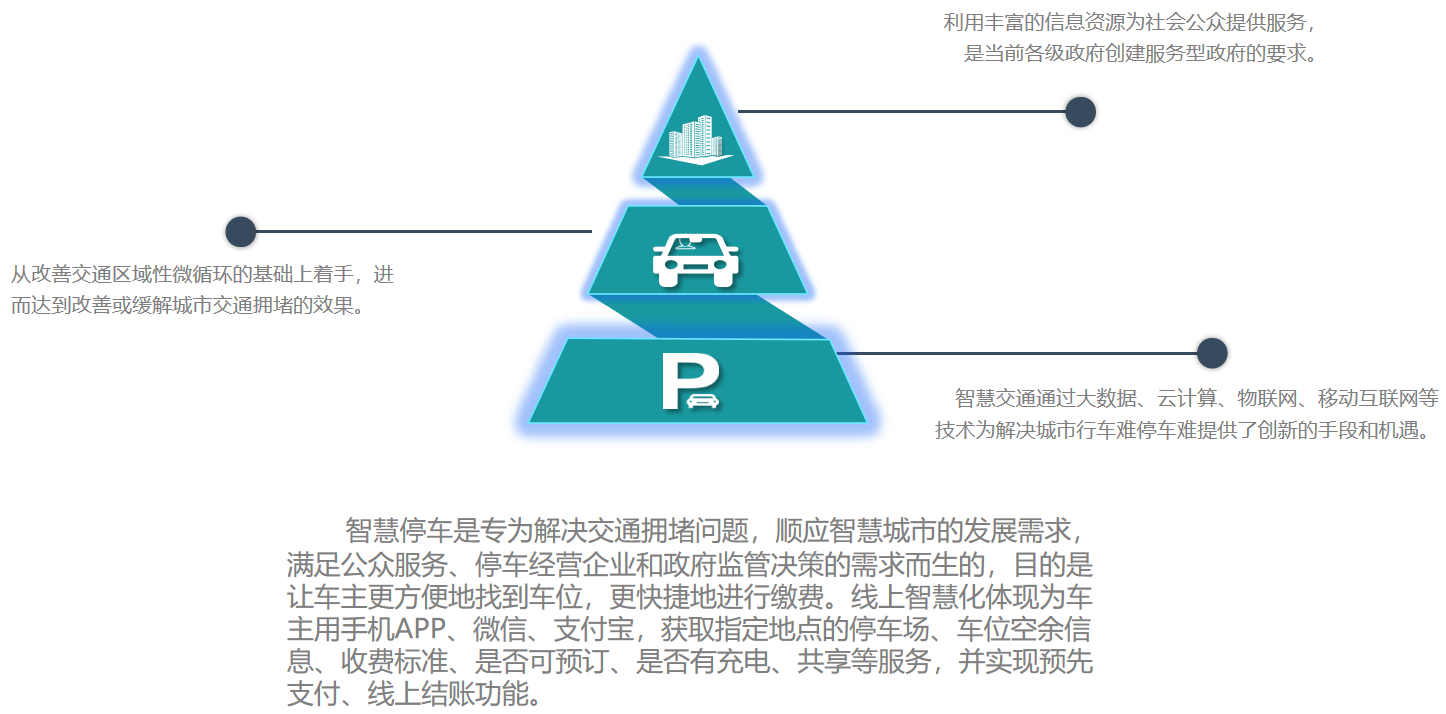智慧停车是指将无线通信技术、移动终端技术、GPS定位技术、GIS技术等综合应用于城市停车位的采集、管理、查询、预订与导航服务,实现停车位资源的实时更新、查询、预订与导航服务一体化,实现停车位资源利用率的最大化、停车场利润的最大化。即通过物联网技术,实现车主停车服务的最优化。